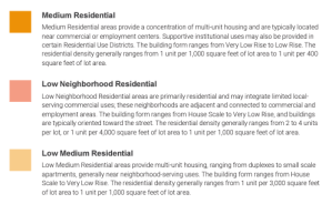 This key, excerpted from this table, shows that in Kentwood and most of Osage (WPDR 1-6), developers will be allowed to build 1 unit/1000 lot ft, or six units on the typical 6K’ lot. The dark orange in Osage allows 1 unit/400′ or 15 units on a 6K’ lot!