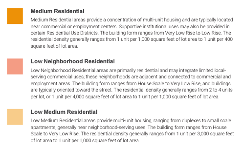 This key shows the proposed number of stories, among other data. So the density for Kentwood and Osage titled on the map as “low medium residential” really means 3 stories tall. The darker orange is up to 5 stories.